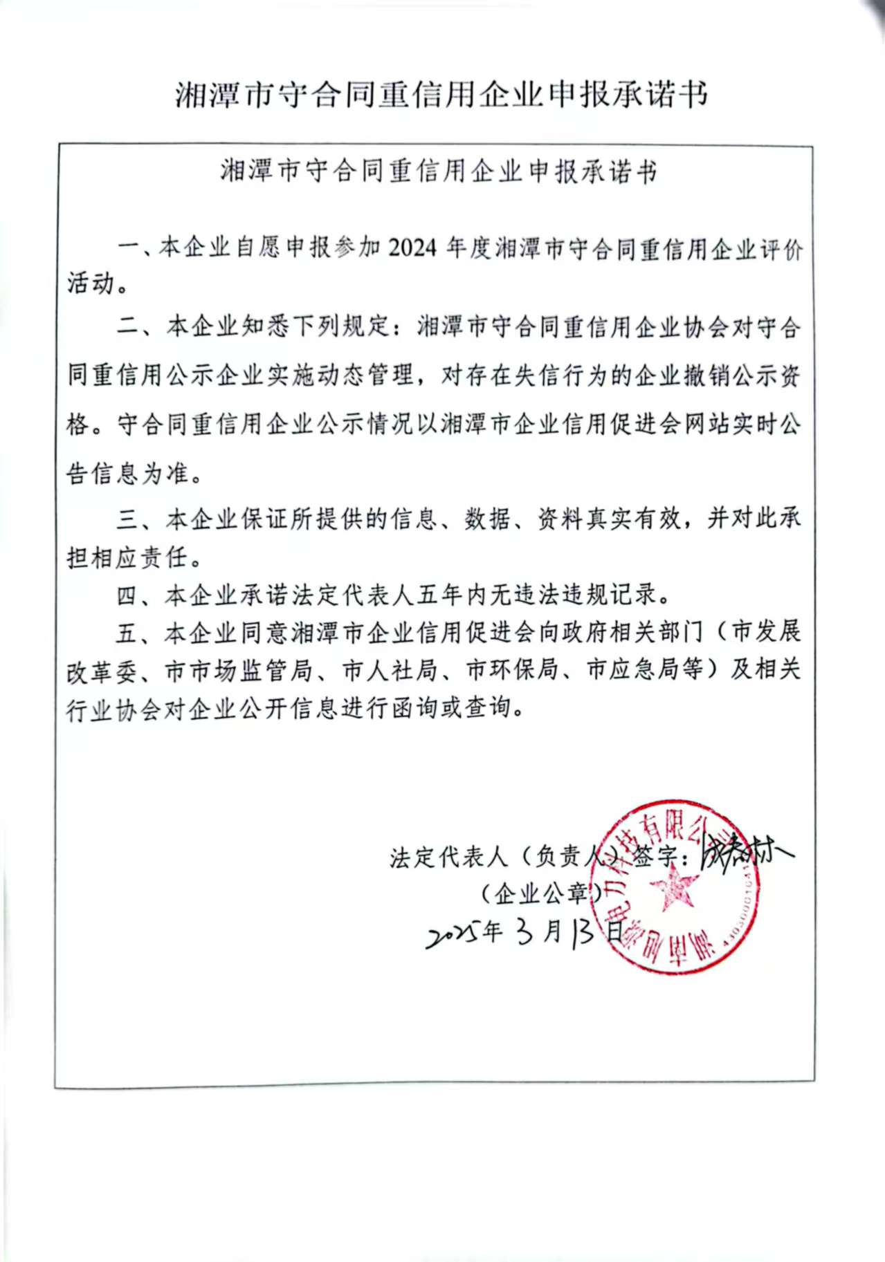 本企業(yè)根據(jù)《湘潭市守合同重信用企業(yè)申報規(guī)定》等編制 2024 年度企業(yè)信用報告書,并保證本報告書內(nèi)容真實、準(zhǔn)確、完整。
