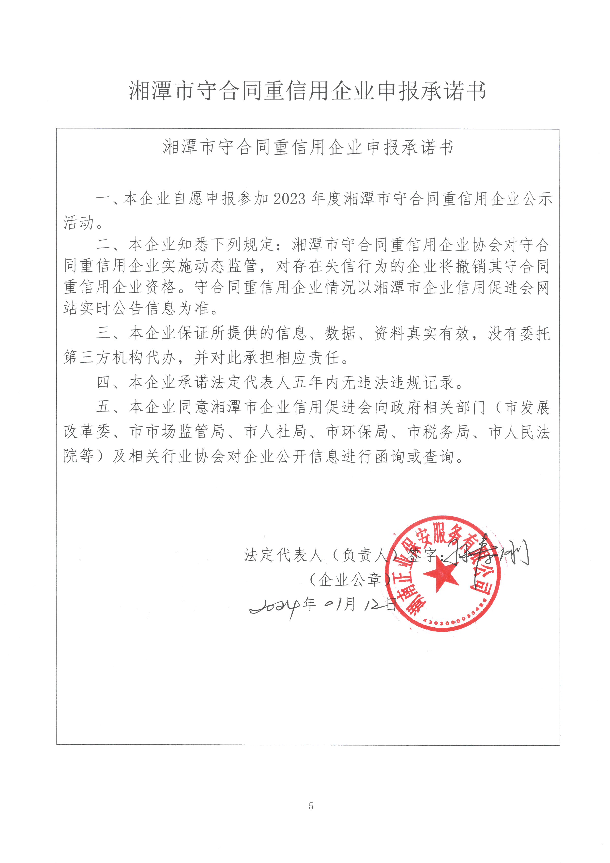 本企業(yè)根據(jù)《湘潭市守合同重信用企業(yè)申報規(guī)定》等編制 2023 年度企業(yè)信用報告書,并保證本報告書內(nèi)容真實、準(zhǔn)確、完整。