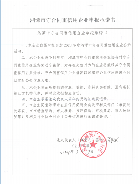 本企業(yè)根據(jù)《湘潭市守合同重信用企業(yè)申報規(guī)定》等編制 2023 年度企業(yè)信用報告書,并保證本報告書內(nèi)容真實、準(zhǔn)確、完整。